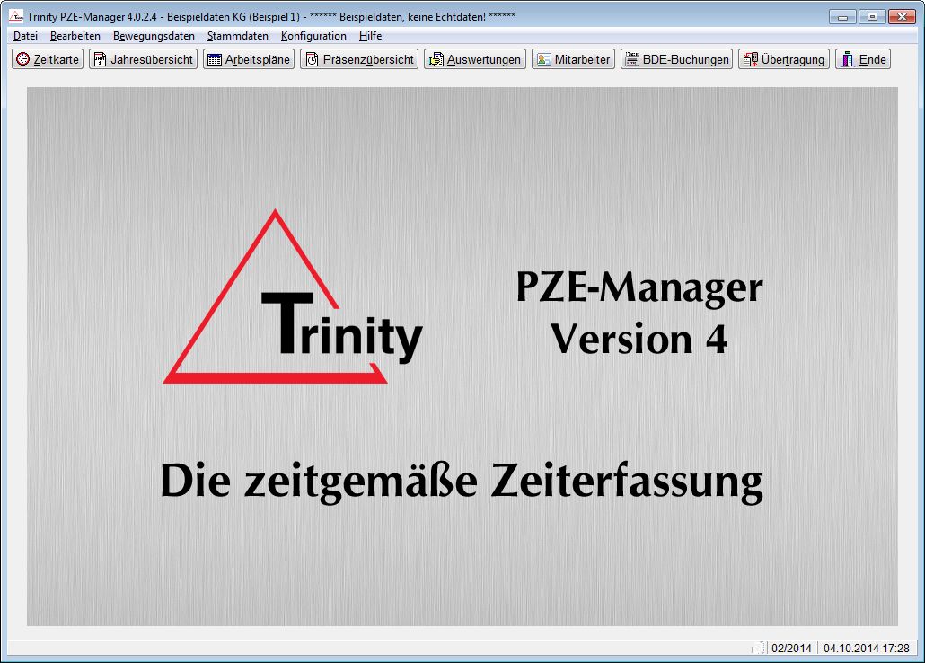 Außerdem muss sich ein Zeiterfassungssystem problemlos in die bestehende EDV-Landschaft einfügen lassen. Die Installation der Trinity Zeitwirtschaftssoftware von CD läuft daher weitgehend automatisch ab. Der Speicherplatzbedarf ist gering (ca. 20 MB für die Grundinstallation plus ca. 10 bis 20 MB pro Jahr an Zeitbuchungen bei 50 Mitarbeitern.). Für ein Zeiterfassungsgerät (Terminal) wird lediglich ein 230V-Stromanschluss sowie ein RJ45-Endgeräteanschluss mit fest zugeordneter IP-Adresse benötigt. Alternativ ist auch eine serielle Anbindung oder eine MODEM-Verbindung über eine Telefonleitung möglich. Nach der Erfassung einiger Grunddaten (Name, Personalnummer und PZE-Ausweisnummer) in der Software können die Mitarbeiter an den Zeiterfassungsgeräten sofort buchen.